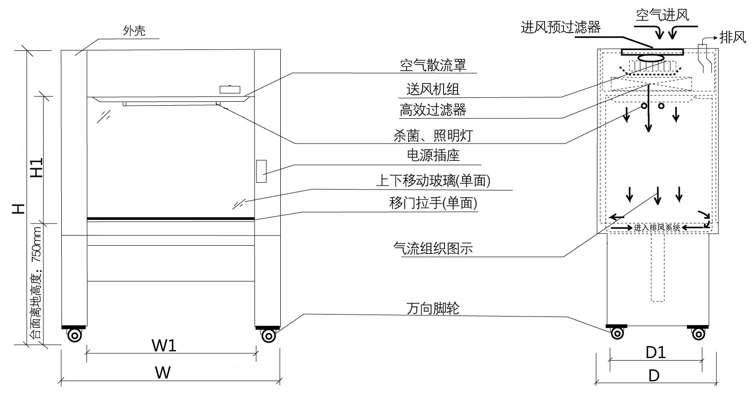 凈化工作臺(tái)由箱體、風(fēng)機(jī)、高效過濾器、操作開關(guān)等幾大部件組成。箱體采用彩鋼板等制作,表面噴塑處理,工作臺(tái)面采用不銹鋼制作。凈化單元采用了可調(diào)風(fēng)量的風(fēng)機(jī)系統(tǒng),通過調(diào)節(jié)風(fēng)機(jī)的工作狀態(tài),可使?jié)崈艄ぷ鲄^(qū)中的平均風(fēng)速保持額定范圍內(nèi),而且有效地延長(zhǎng)了高效過濾器使用壽命。